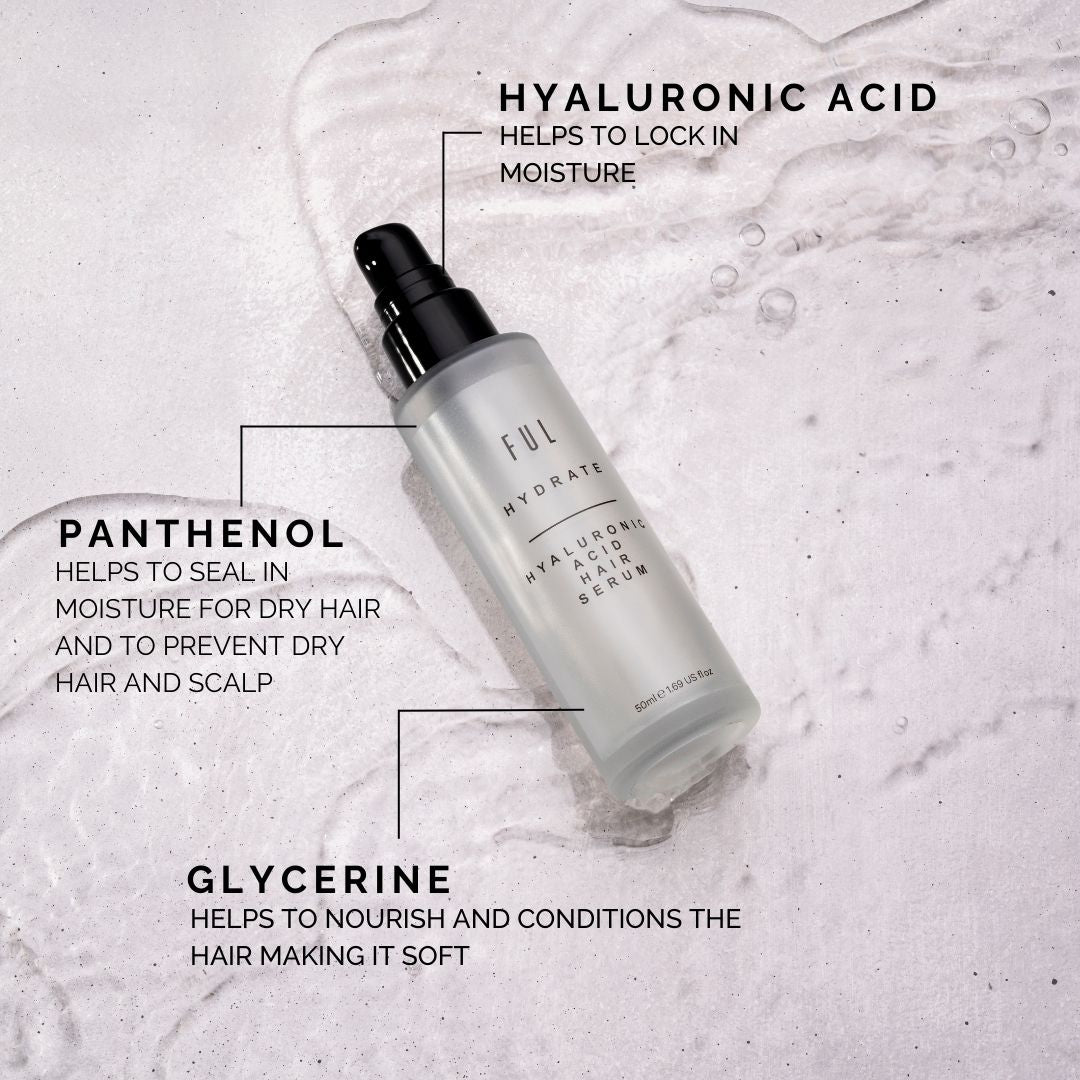 Wet Styling: After washing your hair as usual with your favourite FUL Shampoo and Conditioner, apply a pea-sized amount of FUL Hyaluronic Acid Hair Serum and work through from scalp to the mid-lengths and ends. Style as usual for hydrated hair and minimised flyaways.